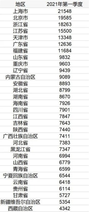 このほど、中国国家統計局が第1四半期の31省の住民1人あたり可処分所得統計を発表した。トップ3は上海市、北京市、浙江省で、唯一2万元を超えたのは上海市で、2万1548元だった。